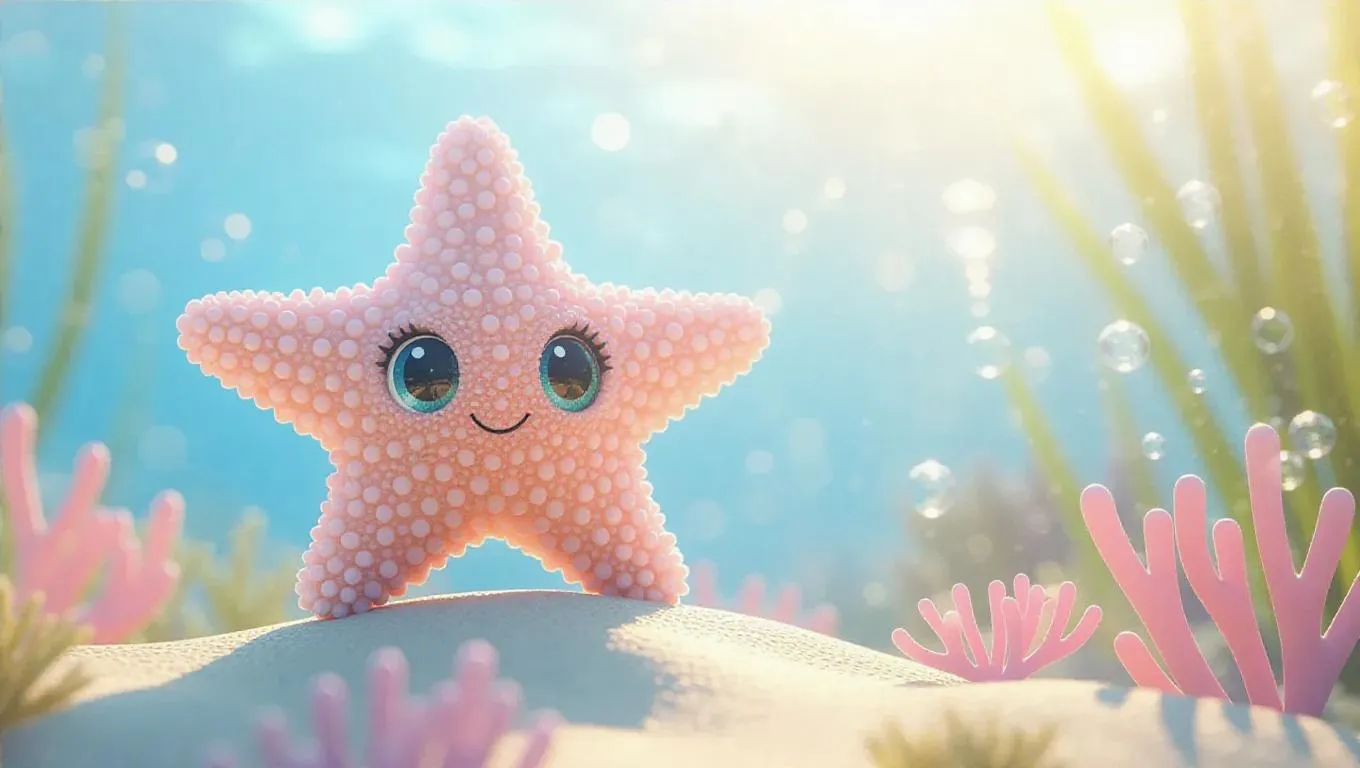 A fluffy, Jellycat-style little starfish stands proudly on a hilltop, overlooking a vast, underwater scene. Its large, expressive eyes are wide with wonder, and its soft, pastel pink arms glisten in the dappled sunlight. The starfish's delicate texture adds to its endearing charm. The underwater scene around it is bathed in warm, soothing light, creating a cozy and inviting atmosphere. The scene is rendered in a soft, pastel color palette, enhancing the overall cuteness and innocence of the starfish.
