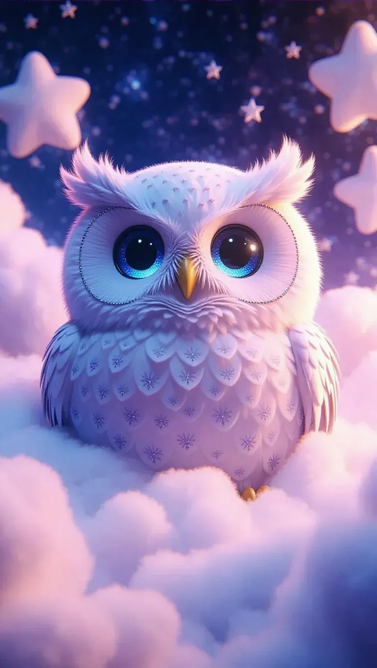 A soft, oversized owl with sparkling eyes and a gentle smile, surrounded by a cloud of cotton-candy-like fluff, creating a dreamy, whimsical atmosphere. The scene is set in a dreamy, fluffy sky with cotton-candy-like clouds and fluffy, oversized stars. The style is inspired by surrealist art, with dreamlike elements and unexpected juxtapositions.