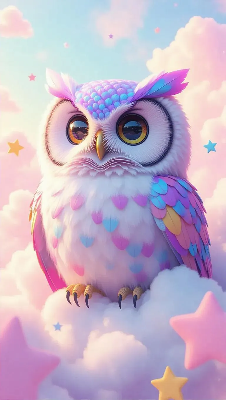 A soft, oversized owl with vibrant feathers and a gentle smile, surrounded by a cloud of cotton-candy-like fluff, creating a dreamy, whimsical atmosphere. The scene is set in a dreamy, fluffy sky with pastel-colored clouds and fluffy, oversized stars. The style is inspired by surrealist art, with dreamlike elements and unexpected juxtapositions.