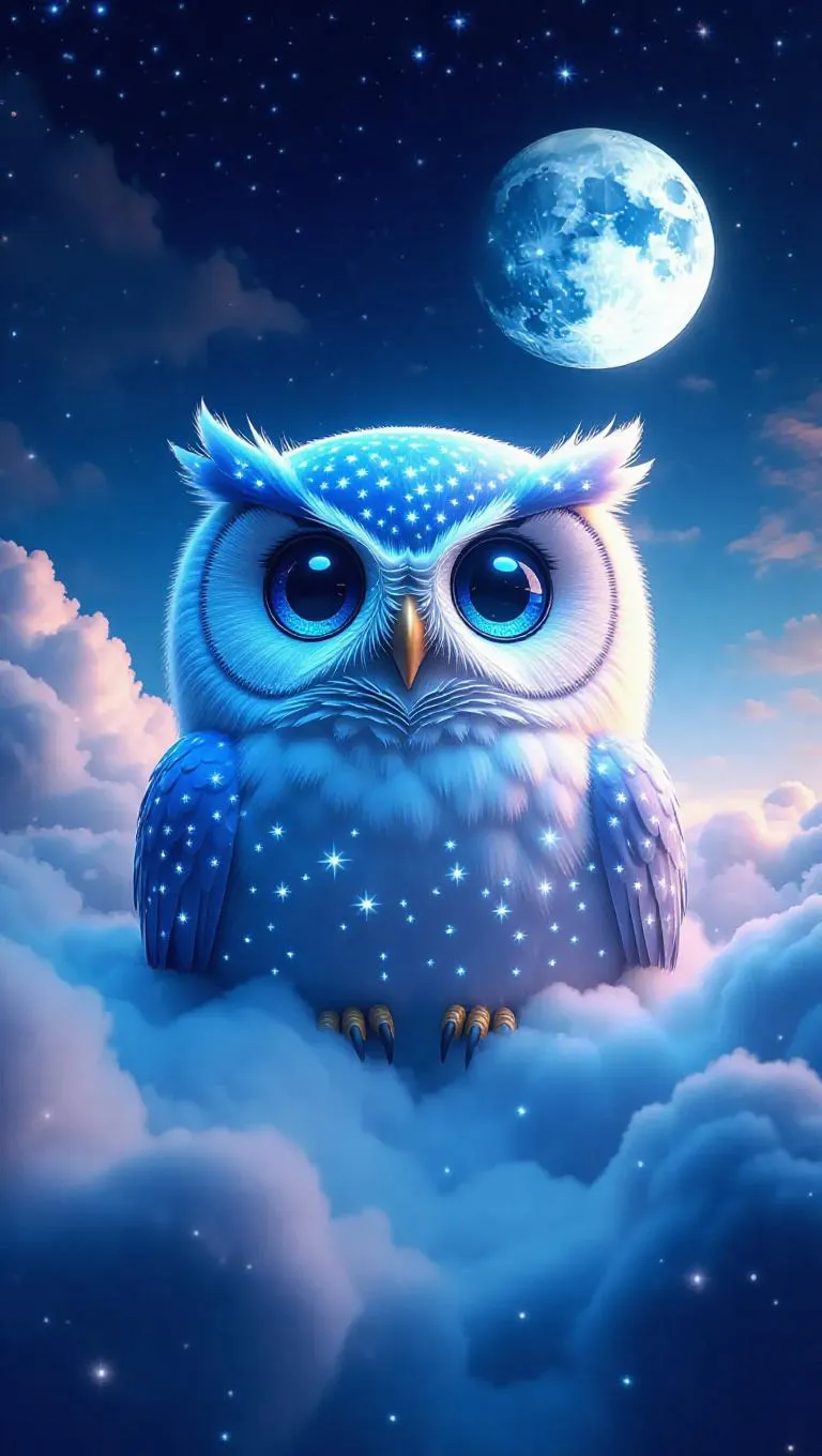 A soft, oversized owl with sparkling eyes and a cheerful expression, surrounded by a cloud of starry fluff, creating a dreamy, whimsical atmosphere. The scene is set in a twilight sky with shimmering clouds and fluffy, oversized moons. The style is inspired by surrealist art, with dreamlike elements and unexpected juxtapositions.