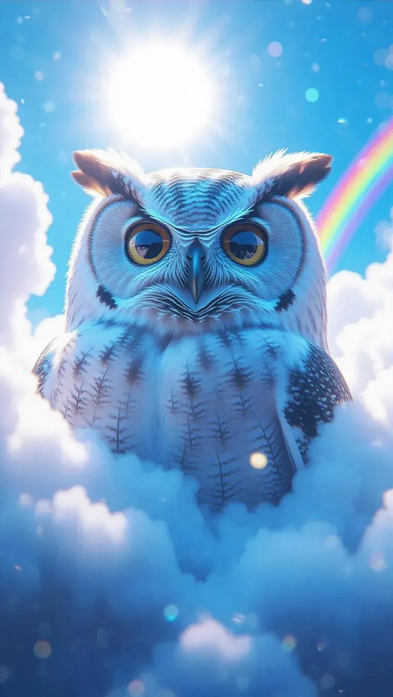 A soft, oversized owl with gentle, wise eyes and a soft smile, surrounded by a cloud of mist-like fluff, creating a dreamy, whimsical atmosphere. The scene is set in a bright, azure sky with fluffy, oversized suns and colorful rainbows. The style is inspired by surrealist art, with dreamlike elements and unexpected juxtapositions.