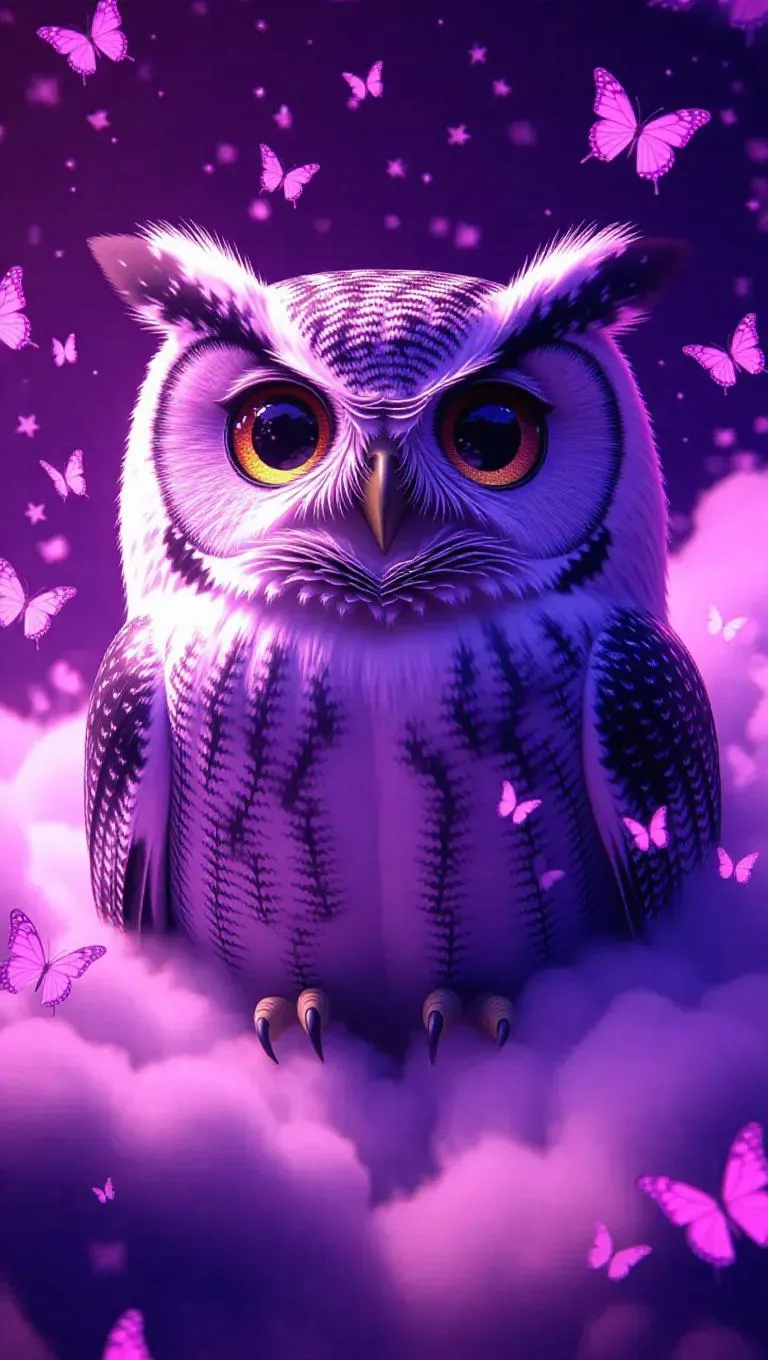 A soft, oversized owl with bright, sparkling eyes and a content smile, surrounded by a cloud of glittering fluff, creating a dreamy, whimsical atmosphere. The scene is set in a violet-hued sky with fluffy, oversized butterflies and cascading stars. The style is inspired by surrealist art, with dreamlike elements and unexpected juxtapositions.
