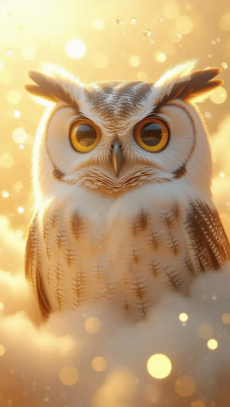 A soft, oversized owl with dazzling eyes and a kind smile, surrounded by a cloud of fluffy, feather-like fluff, creating a dreamy, whimsical atmosphere. The scene is set in a golden sunset sky with fluffy, oversized raindrops and shimmering lights. The style is inspired by surrealist art, with dreamlike elements and unexpected juxtapositions.
