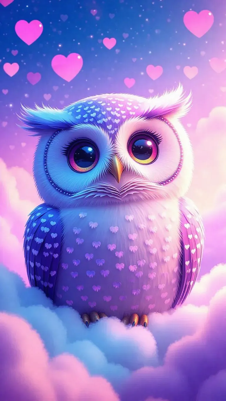 A soft, oversized owl with enchanting, wide eyes and a soft grin, surrounded by a cloud of sparkling, twinkling fluff, creating a dreamy, whimsical atmosphere. The scene is set in a colorful sky filled with fluffy, oversized hearts and whimsical patterns. The style is inspired by surrealist art, with dreamlike elements and unexpected juxtapositions.