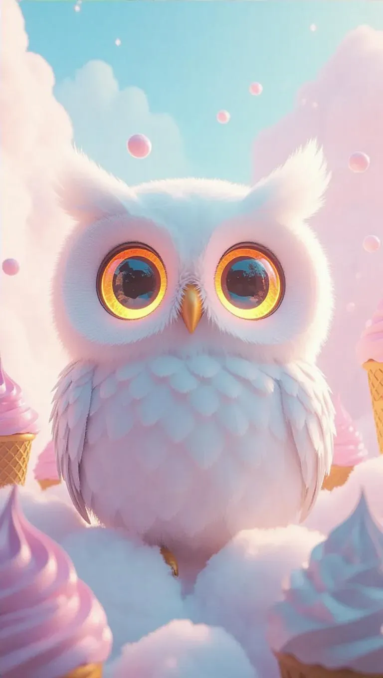 A soft, oversized owl with radiant, glowing eyes and a warm smile, surrounded by a cloud of dreamy, soft fluff, creating a whimsical atmosphere. The scene is set in a pastel sky with fluffy, oversized ice cream cones and playful animals. The style is inspired by surrealist art, with dreamlike elements and unexpected juxtapositions.