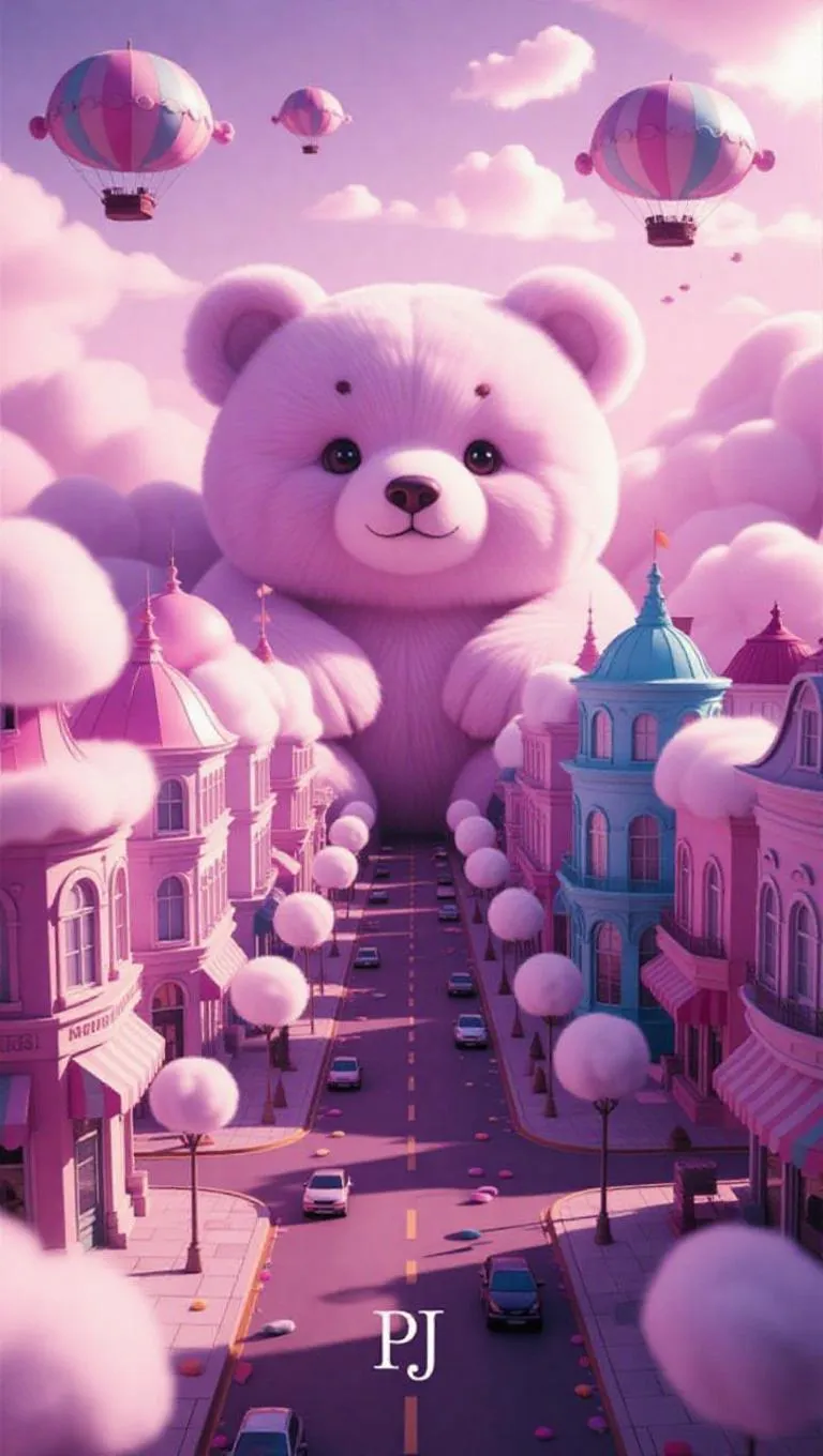 A pastel-colored cityscape viewed from above, where buildings and streets subtly form a fluffy, adorable bear. The city features soft, cloud-like structures and rounded, jelly-like buildings. Floating cotton candy flowers line the streets, and the roads are paved with candy-like tiles. Warm lavender light casts a soft, magical haze, enhancing the whimsical and kawaii aesthetic. Airships shaped like friendly creatures gently float in the sky, contributing to the ultra-detailed, cinematic composition that balances realism and fantasy, evoking wonder and happiness. The style is reminiscent of a children's storybook illustration, with whimsical details and a playful tone.