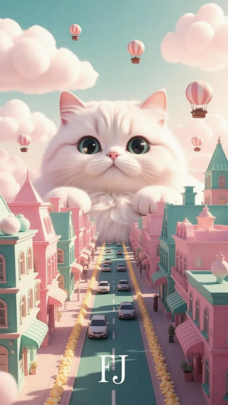 A pastel-colored cityscape viewed from above, where buildings and streets subtly form a fluffy, adorable cat. The city features soft, cloud-like structures and rounded, marshmallow-like buildings. Floating cotton candy stars line the streets, and the roads are paved with buttery popcorn tiles. Warm teal light casts a soft, magical haze, enhancing the whimsical and kawaii aesthetic. Airships shaped like cartoon characters gently float in the sky, contributing to the ultra-detailed, cinematic composition that balances realism and fantasy, evoking wonder and delight. The style is reminiscent of a children's storybook illustration, with whimsical details and a playful tone.