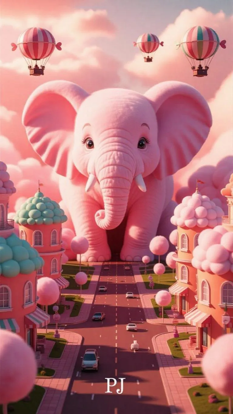 A pastel-colored cityscape viewed from above, where buildings and streets subtly form a fluffy, adorable elephant. The city features soft, cloud-like structures and rounded, berry-like buildings. Floating cotton candy balloons line the streets, and the roads are paved with fudge-like tiles. Warm orange light casts a soft, magical haze, enhancing the whimsical and kawaii aesthetic. Airships shaped like cartoon animals gently float in the sky, contributing to the ultra-detailed, cinematic composition that balances realism and fantasy, evoking wonder and comfort. The style is reminiscent of a children's storybook illustration, with whimsical details and a playful tone.