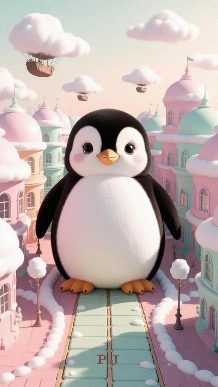 A pastel-colored cityscape viewed from above, where buildings and streets subtly form a fluffy, adorable penguin. The city features soft, cloud-like structures and rounded, ice cream-like buildings. Floating cotton candy snowflakes line the streets, and the roads are paved with cream-like tiles. Warm mint light casts a soft, magical haze, enhancing the whimsical and kawaii aesthetic. Airships shaped like snowy creatures gently float in the sky, contributing to the ultra-detailed, cinematic composition that balances realism and fantasy, evoking wonder and laughter. The style is reminiscent of a children's storybook illustration, with whimsical details and a playful tone.