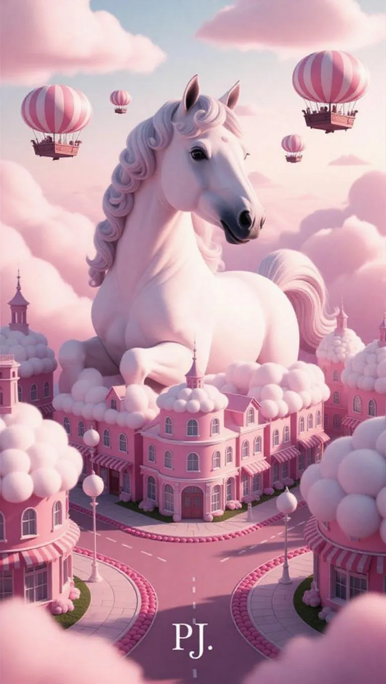 A pastel-colored cityscape viewed from above, where buildings and streets subtly form a fluffy, adorable horse. The city features soft, cloud-like structures and rounded, biscuit-like buildings. Floating cotton candy spirals line the streets, and the roads are paved with berry tart-like tiles. Warm honey light casts a soft, magical haze, enhancing the whimsical and kawaii aesthetic. Airships shaped like playful foals gently float in the sky, contributing to the ultra-detailed, cinematic composition that balances realism and fantasy, evoking wonder and cheer. The style is reminiscent of a children's storybook illustration, with whimsical details and a playful tone.