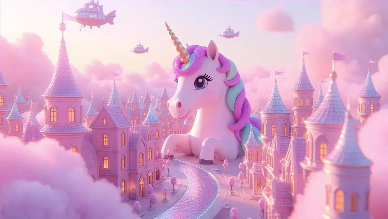 A pastel-colored cityscape viewed from above, where buildings and streets subtly form a fluffy, adorable unicorn. The city features soft, cloud-like structures and rounded, macaroon-like buildings. Floating cotton candy sparkles line the streets, and the roads are paved with rainbow-like tiles. Warm silver light casts a soft, magical haze, enhancing the whimsical and kawaii aesthetic. Airships shaped like mythical creatures gently float in the sky, contributing to the ultra-detailed, cinematic composition that balances realism and fantasy, evoking wonder and enchantment. The style is reminiscent of a children's storybook illustration, with whimsical details and a playful tone.