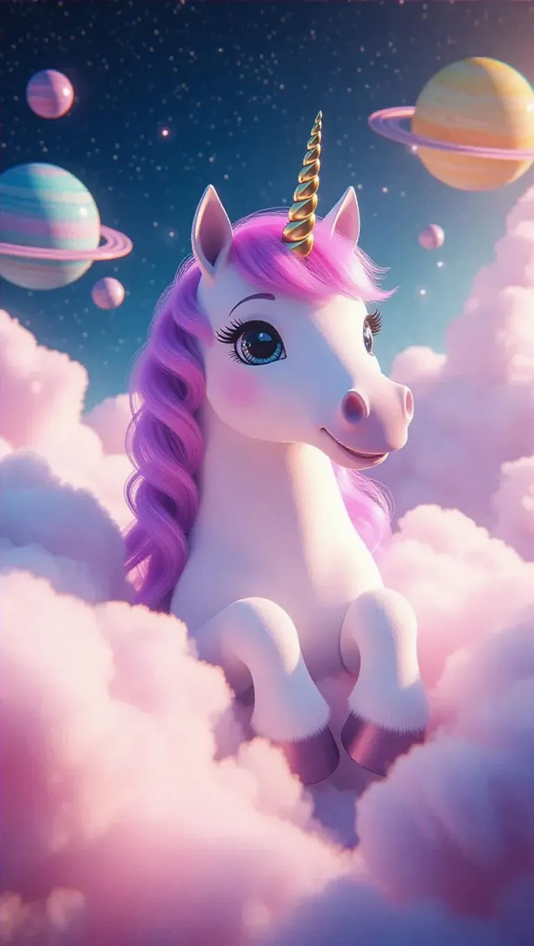 A soft, oversized unicorn with sparkling eyes and a gentle smile, surrounded by a cloud of cotton-candy-like fluff, creating a dreamy, whimsical atmosphere. The scene is set in a fluffy, oversized space with cotton-candy-like planets and fluffy, oversized stars. The style is inspired by surrealist art