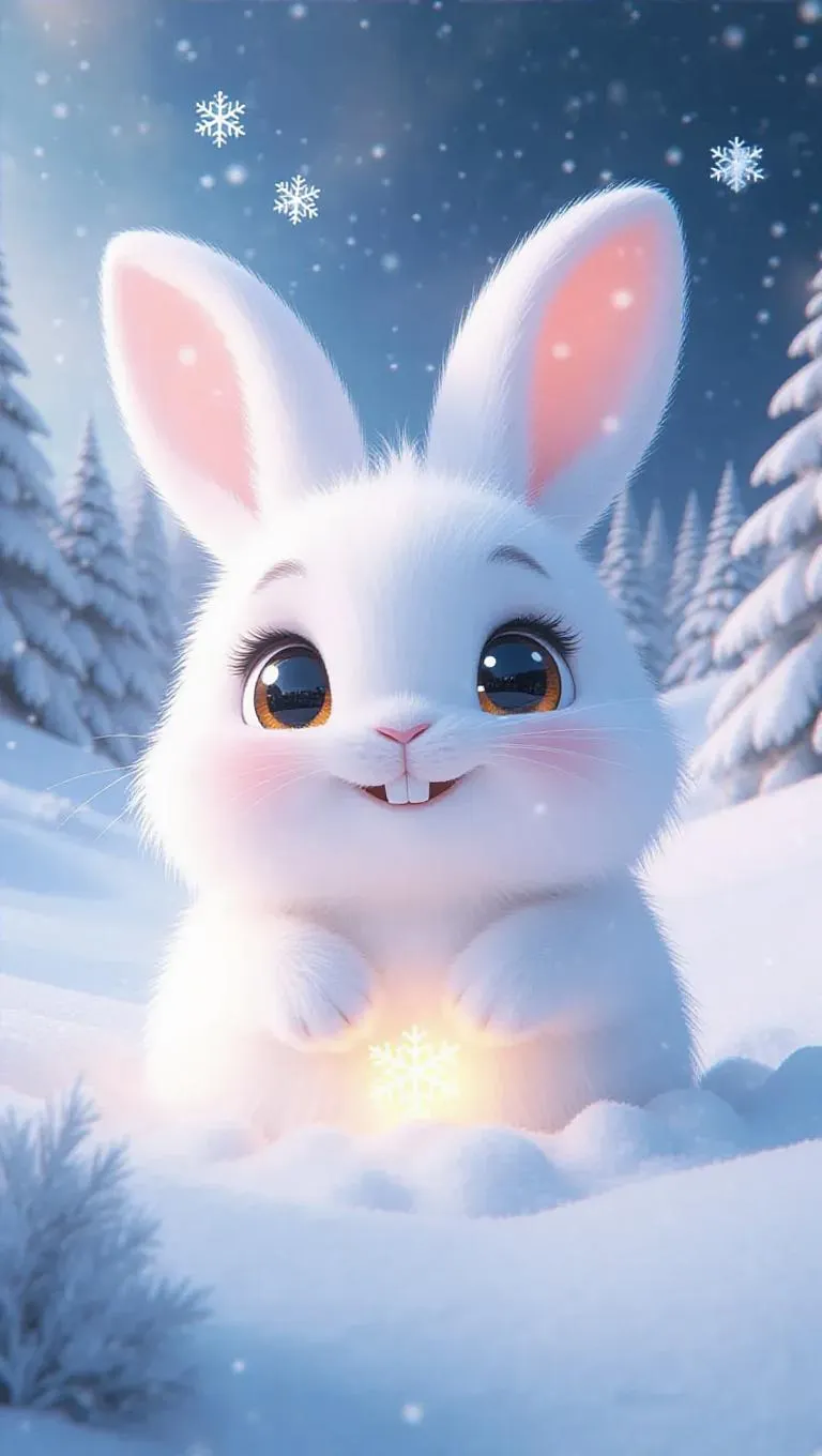 A soft, oversized rabbit with glowing eyes and a cheerful smile, surrounded by a cloud of snow-like fluff, creating a charming, whimsical atmosphere. The scene is set in a fluffy, oversized winter landscape with snow-like hills and fluffy, oversized snowflakes. The style is inspired by surrealist art.