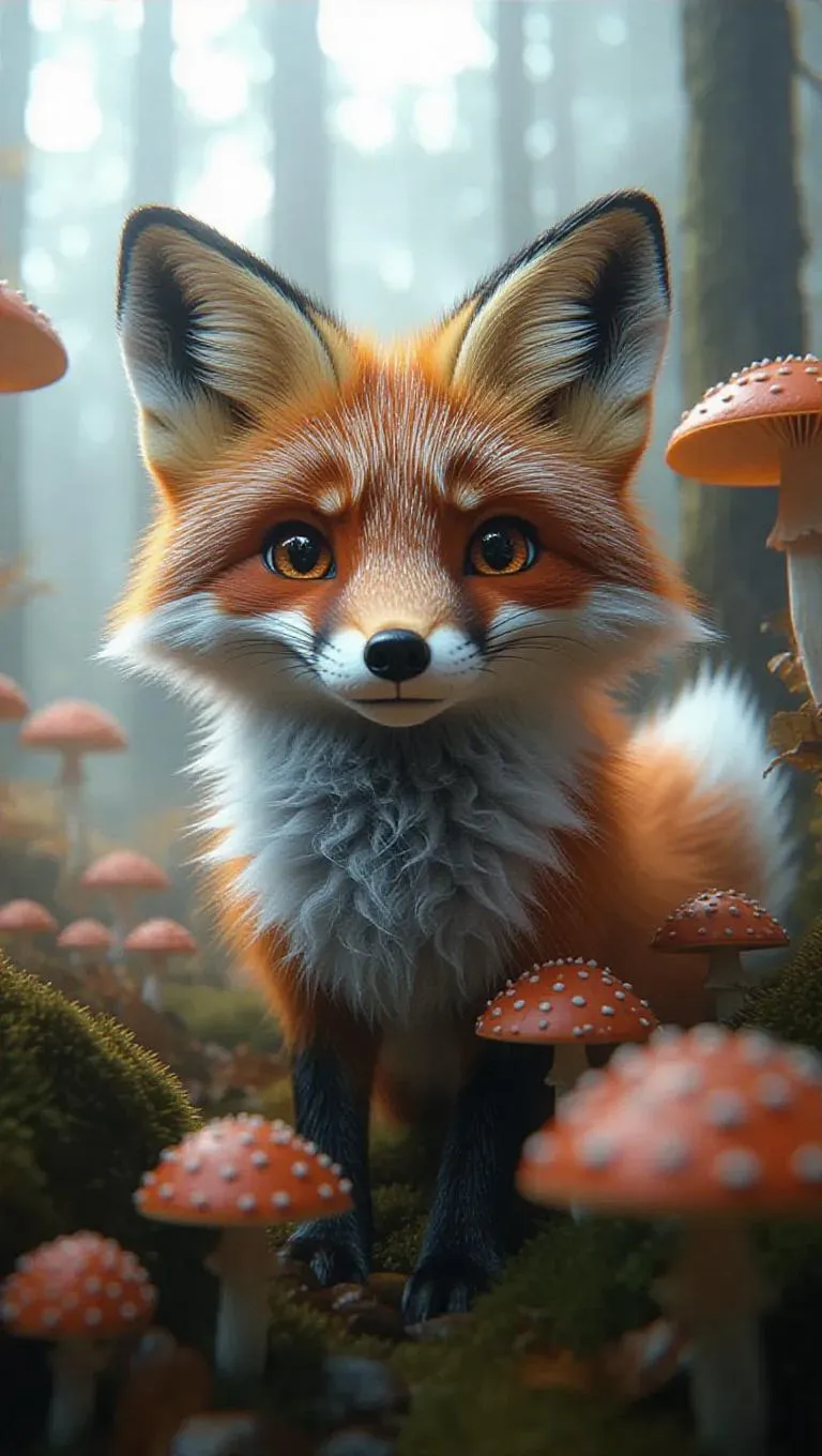 A soft, oversized fox with sparkling eyes and a sly grin, surrounded by a cloud of mist-like fluff, creating a delightful, whimsical atmosphere. The scene is set in a fluffy, oversized woodland with mist-like shrubs and fluffy, oversized mushrooms. The style is inspired by surrealist art.