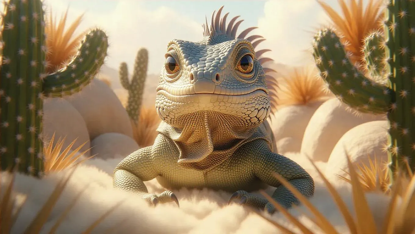 A soft, oversized iguana with glimmering eyes and a calm smile, surrounded by a cloud of leaf-like fluff, creating a tranquil, whimsical atmosphere. The scene is set in a fluffy, oversized desert with leaf-like cacti and fluffy, oversized rocks. The style is inspired by surrealist art.