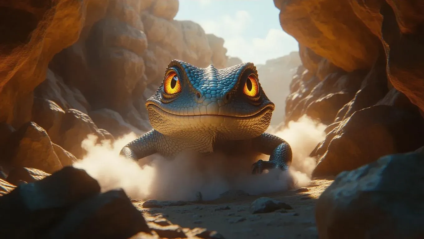 A soft, oversized lizard with glowing eyes and a quirky grin, surrounded by a cloud of rock-like fluff, creating a quirky, whimsical atmosphere. The scene is set in a fluffy, oversized canyon with rock-like formations and fluffy, oversized critters. The style is inspired by surrealist art.