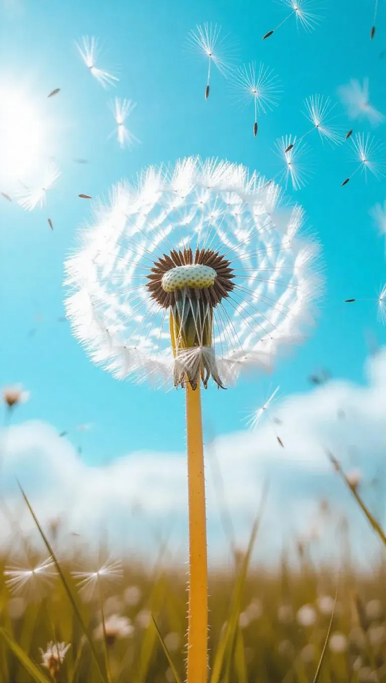 A giant dandelion puff made of delicate cotton, with tiny, fluffy seeds resembling a child's plaything, soaring through a clear blue sky with bright shades, providing a magical and ethereal vibe to the landscape.