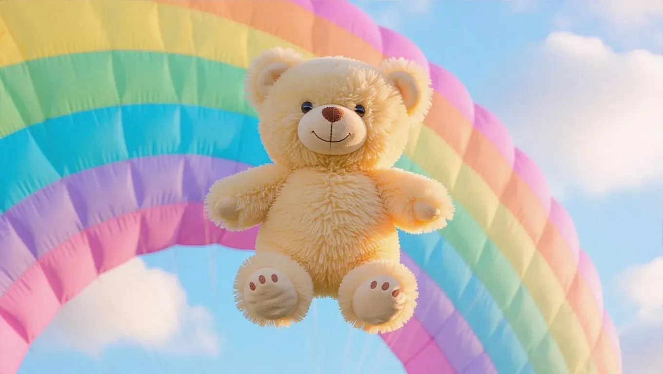 A li'l teddy bear blimp made of fluffy fabric, with stitched features resembling a beloved childhood toy, gliding softly through a pastel rainbow sky, creating a nostalgic and heartwarming experience floating above.