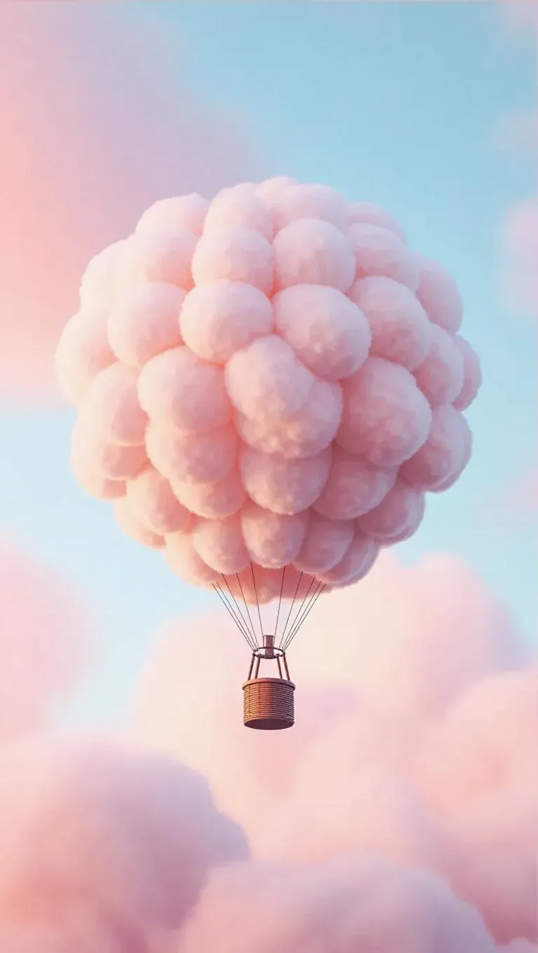 A charming fluffy hot air balloon made of puffy, textured fabric, with short, curled strands resembling cotton candy, drifting through a soft pastel sky, invoking a surreal and playful scene with a touch of magical delight.