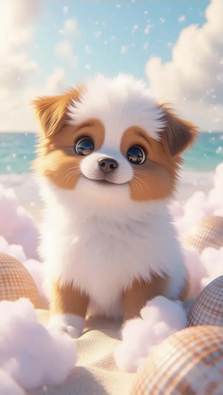 A soft, oversized puppy with sparkling eyes and a gentle smile, surrounded by a cloud of cotton-candy-like fluff, creating a dreamy, whimsical atmosphere. The scene is set in a fluffy, oversized beach with cotton-candy-like waves and fluffy, oversized seashells. The style is inspired by digital 3D rendering, with smooth textures and vibrant colors.