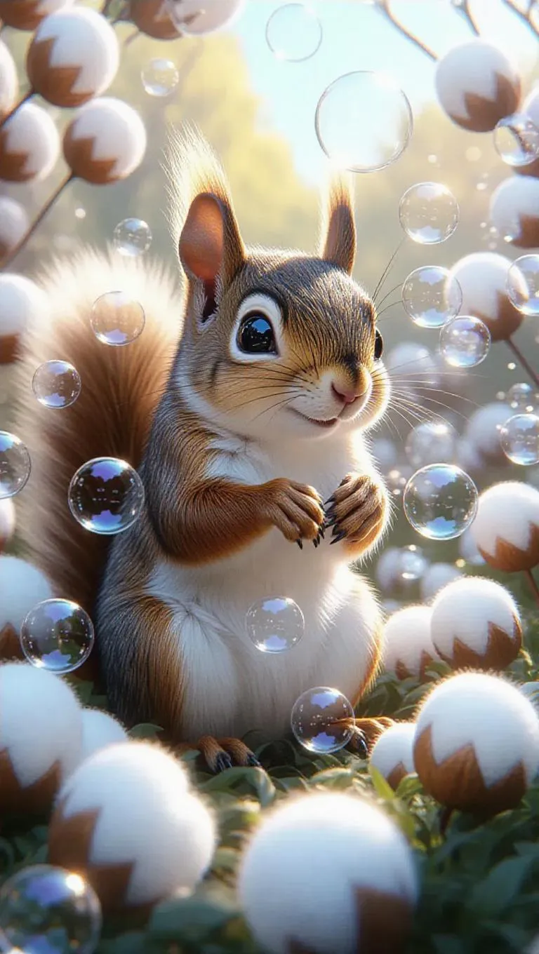 A soft, fluffy squirrel with bright eyes and a curious look, enveloped in a swirl of whimsical bubbles, creating a playful, cheerful atmosphere. The scene is set in a lush, oversized garden with cotton-candy-like bushes and fluffy, oversized acorns. The style is inspired by comic book art, with dynamic lines and saturated colors.