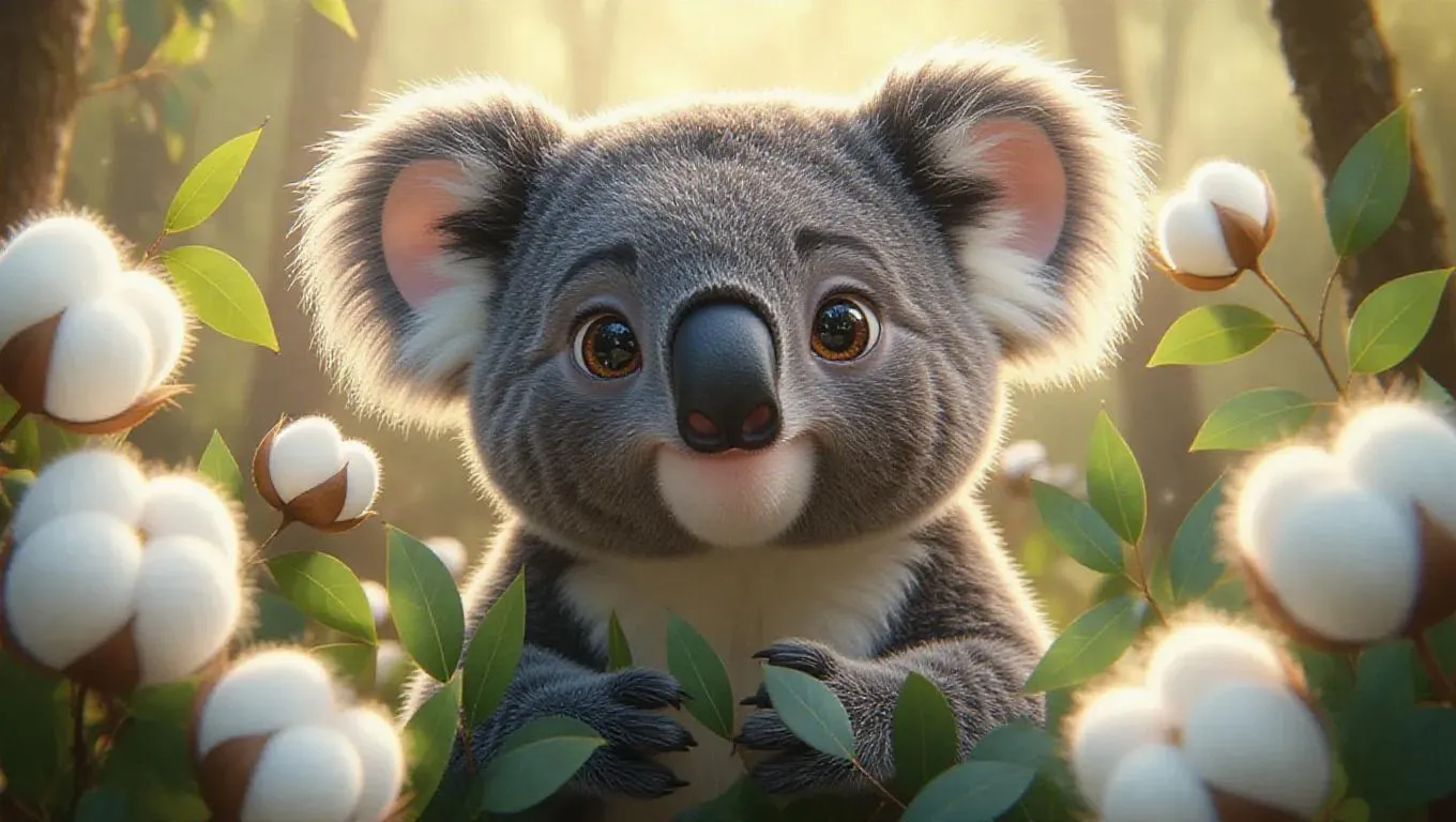 An adorable, fluffy koala with twinkling eyes and a mellow smile, surrounded by a swirl of gentle eucalyptus leaves, creating a tranquil, serene atmosphere. The scene features a lush, oversized forest with cotton-candy-like trees and fluffy, oversized flowers blooming throughout. The style is inspired by digital caricature, with playful exaggeration and vibrant palettes.