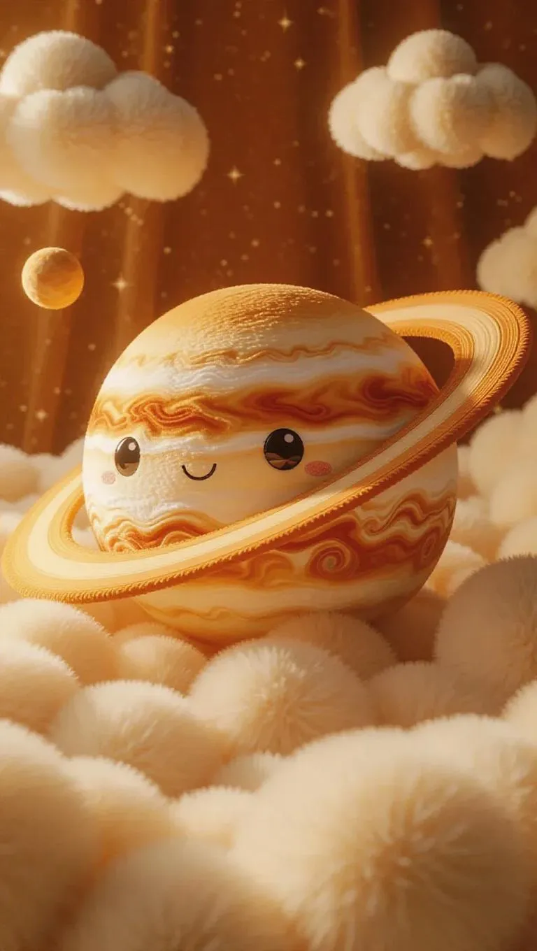 A whimsical depiction of Jupiter in Jellycat style, where the planet is rendered as a giant, fluffy ball of soft, striped fur. The Great Red Spot is depicted as a plush swirl, and the clouds are velvety and soft. The entire scene is bathed in warm, amber light, creating a majestic and inviting atmosphere. The style is playful and cuddly, perfect for a children's book or a cozy home decor piece.