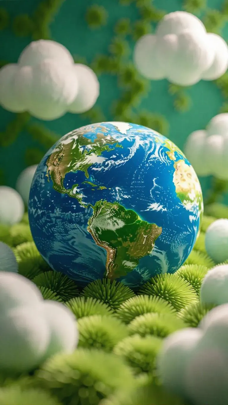 A whimsical depiction of Earth in Jellycat style, where the planet is rendered as a giant, fluffy ball of soft, patchy fur. The continents are depicted as plush shapes, and the clouds are velvety and soft. The entire scene is bathed in vibrant, green light, creating a lively and inviting atmosphere. The style is playful and cuddly, perfect for a children's book or a cozy home decor piece.
