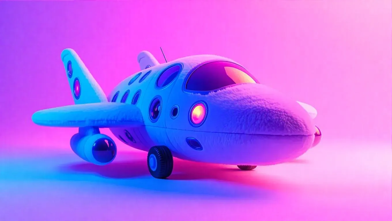A whimsical depiction of a spaceship in Jellycat style, where it is rendered as a giant, fluffy model made of soft, colorful fur. The wings are depicted as plush flaps, and the controls are velvety and soft. The entire scene is bathed in neon, vibrant light, creating an adventurous and inviting atmosphere. The style is playful and cuddly, perfect for a children's book or a cozy home decor piece.