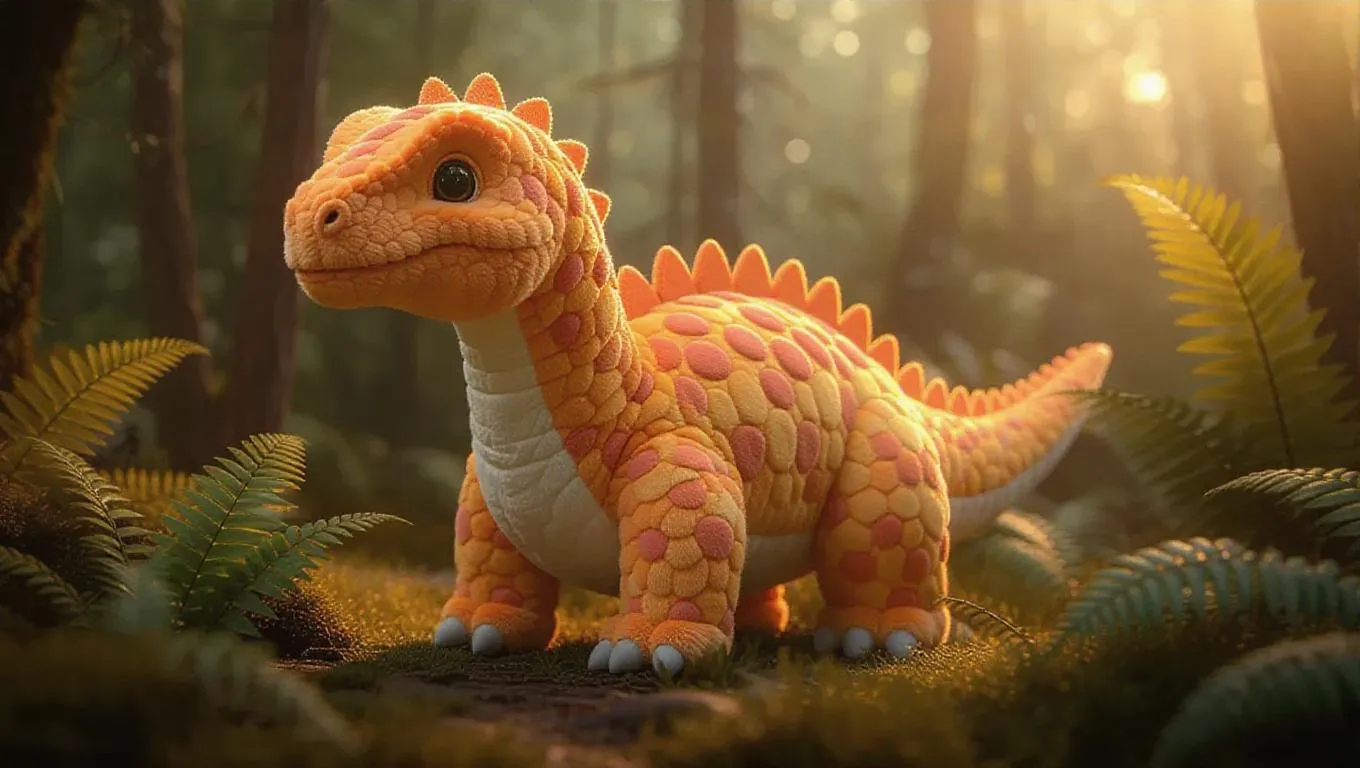 A whimsical depiction of a dinosaur in Jellycat style, where the creature is rendered as a giant, fluffy figure made of soft, patterned fur. The scales are depicted as plush textures, and the landscape is velvety and soft. The entire scene is bathed in warm, earthy light, creating a playful and inviting atmosphere. The style is playful and cuddly, perfect for a children's book or a cozy home decor piece.