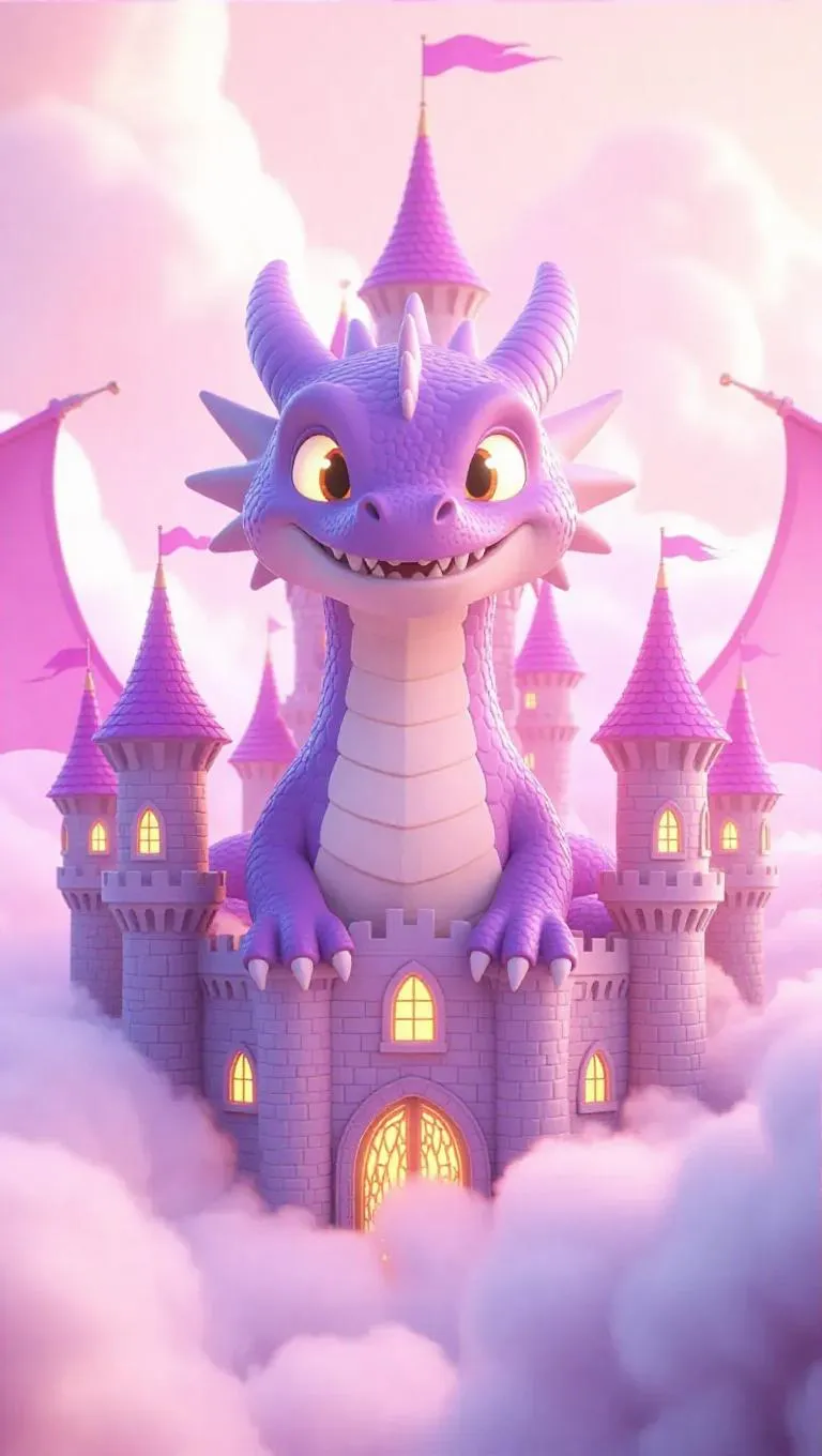 A soft, oversized dragon with glowing eyes and a playful grin, surrounded by a swirl of cotton-candy-like mist, creating a magical, enchanting atmosphere. The scene is set in a fluffy, oversized castle with cotton-candy-like walls and fluffy, oversized banners. The style is reminiscent of a fairy tale illustration, with charming details and a joyful tone.