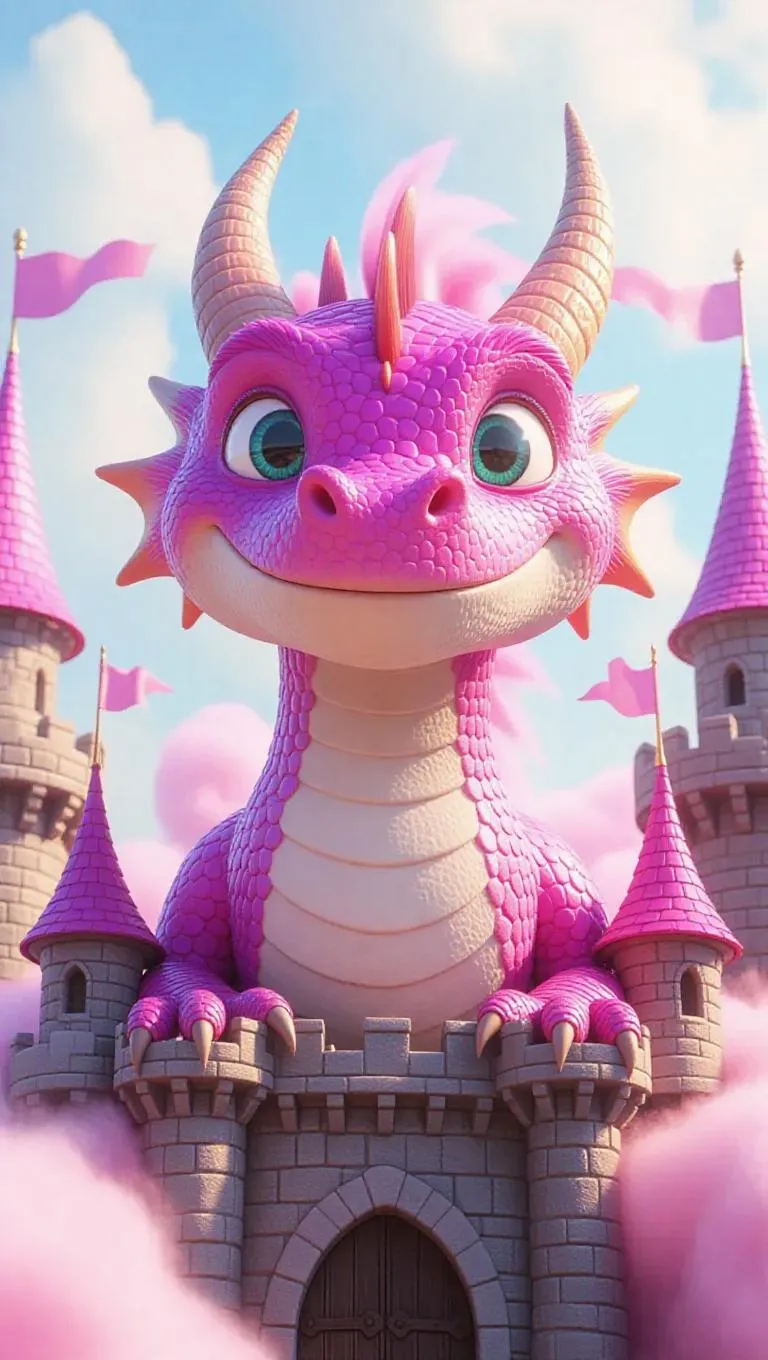 A charming, oversized dragon with dazzling eyes and a delightful smile, enveloped in a mass of cotton-candy-like fluff, crafting a mystical, surreal setting. The scene is outlined by a fluffy, substantial castle with cotton-candy-like features and oversized, fluffy flags. The visual style is akin to a joyful children’s storybook, full of fanciful elements and a lighthearted ambiance.