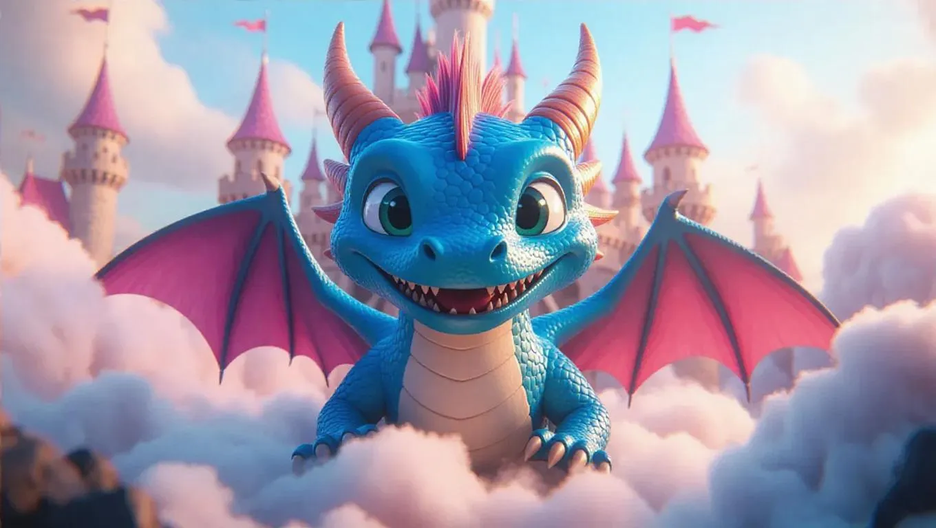 A lively, oversized dragon with bright eyes and a playful grin, surrounded by drifting cotton-candy-like vapor, creating a dreamy and colorful scenery. The setting includes a soft, massive castle with cotton-candy-like spires and fluffy, oversized decorations. The style resembles a whimsical storybook, filled with imaginative and joyful elements.