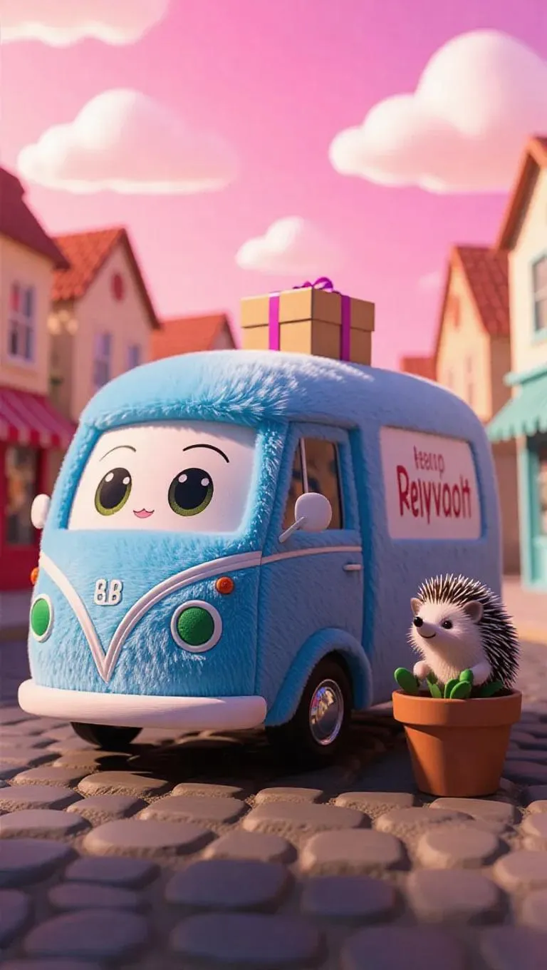 A fluffy, Jellycat-style delivery van with soft, rounded edges and large, expressive eyes is parked in a charming, retro-style town, rescuing a tiny hedgehog from a low flower pot. Its body is covered in plush, blue fur, with green paws and a tiny, adorable package on top. The clear pink sky above is dotted with fluffy clouds, and soft, warm sunlight filters through, casting gentle shadows and highlighting the truck's cuddly texture. The scene exudes a whimsical, heartwarming charm, perfect for a children's storybook.