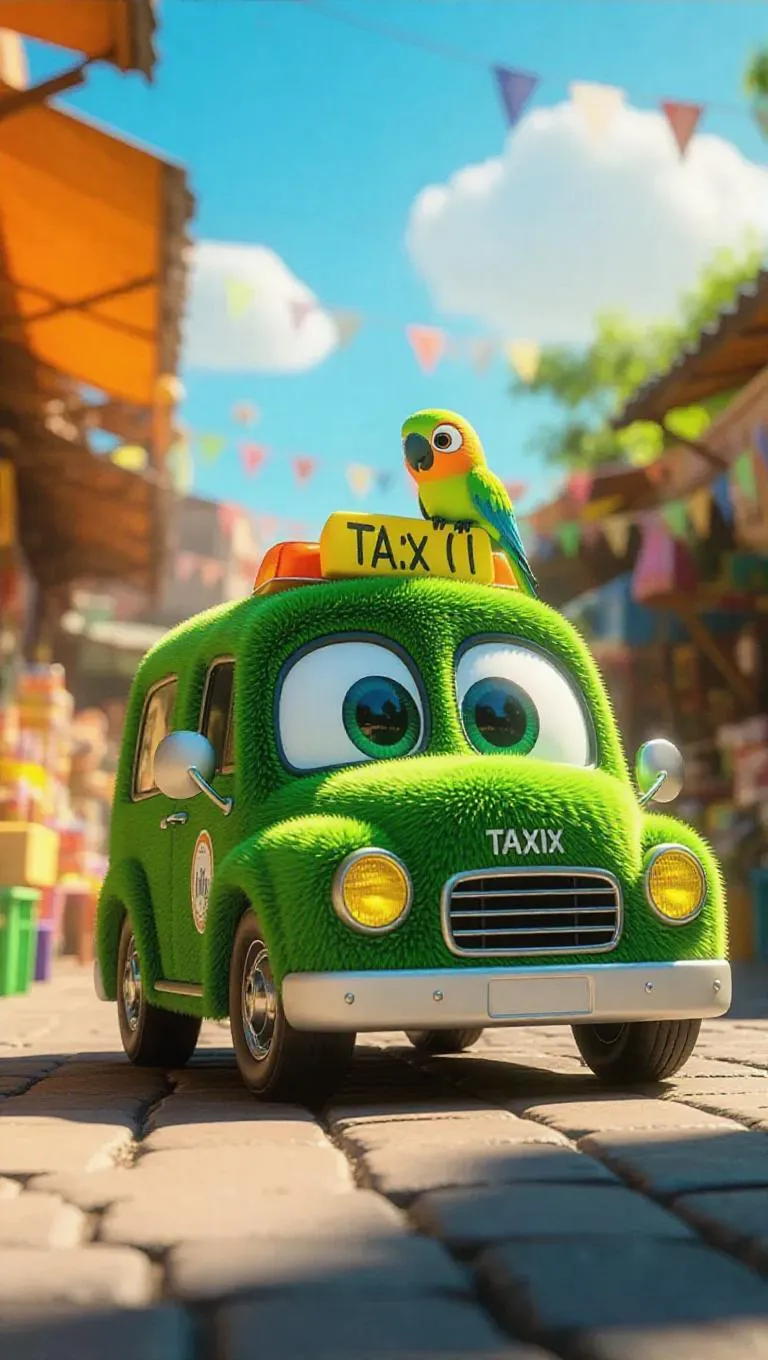 A fluffy, Jellycat-style taxi with soft, rounded edges and large, expressive eyes is parked in a lively, colorful market, rescuing a tiny parrot from a low stall. Its body is covered in plush, green fur, with white paws and a tiny, adorable taxi sign on top. The clear blue sky above is dotted with fluffy clouds, and soft, warm sunlight filters through, casting gentle shadows and highlighting the truck's cuddly texture. The scene exudes a dynamic, bustling charm, perfect for a children's storybook.
