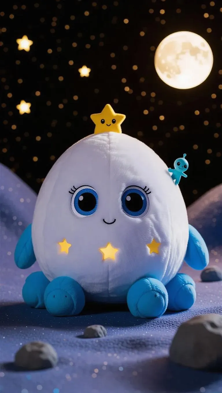 A fluffy, Jellycat-style spaceship with soft, rounded edges and large, expressive eyes is parked in a dreamy, starry night sky, rescuing a tiny alien from a low asteroid. Its body is covered in plush, silver fur, with blue paws and a tiny, adorable star on top. The clear black sky above is dotted with twinkling stars, and soft, warm moonlight filters through, casting gentle shadows and highlighting the truck's cuddly texture. The scene exudes a magical, otherworldly charm, perfect for a children's storybook.