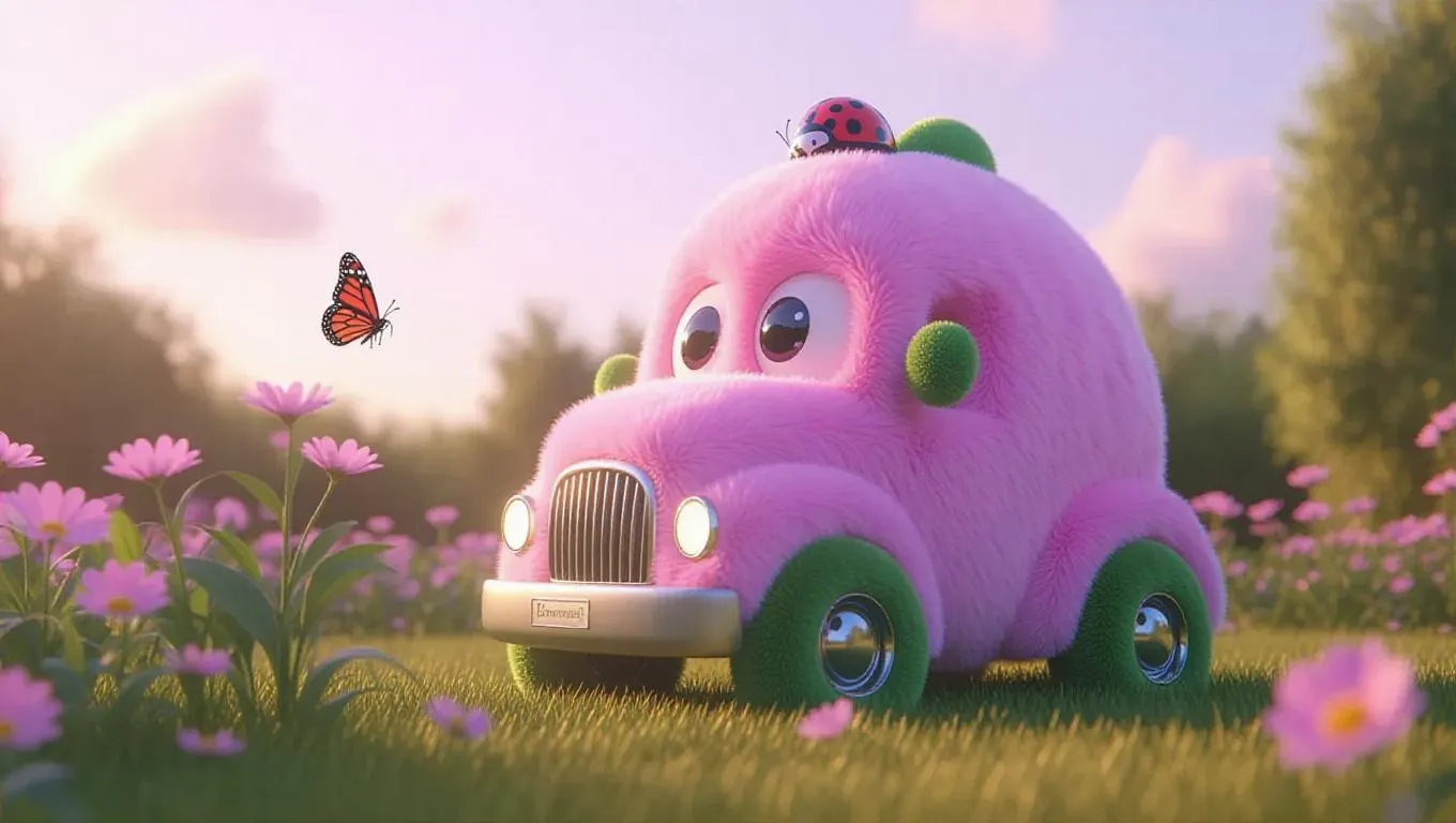 A fluffy, Jellycat-style balloon animal with soft, rounded edges and large, expressive eyes is parked in a cozy garden, rescuing a tiny butterfly from a low flower. Its body is covered in plush, pink fur, with green paws and a tiny, adorable ladybug on top. The clear lavender sky above is dotted with fluffy clouds, and soft, warm sunlight filters through, casting gentle shadows and highlighting the truck's cuddly texture. The scene exudes a soft, gentle charm, perfect for a children's storybook.
