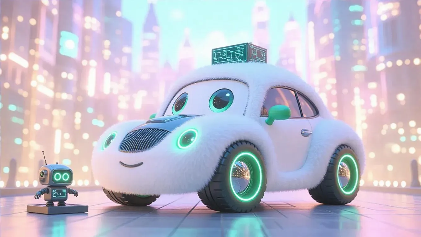 A fluffy, Jellycat-style roadster with soft, rounded edges and large, expressive eyes is parked in a sparkling, futuristic city, rescuing a tiny robot from a low platform. Its body is covered in plush, metallic fur, with neon green paws and a tiny, adorable circuit board on top. The clear silver sky above is dotted with fluffy holograms, and soft, warm lights filter through, casting gentle shadows and highlighting the truck's cuddly texture. The scene exudes a high-tech, innovative charm, perfect for a children's storybook.