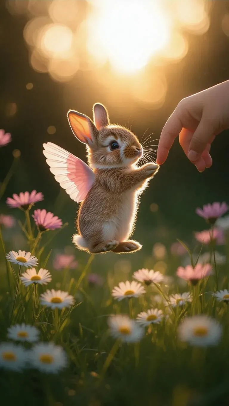 A little bunny with pink wings on its back clings to the end of a child's finger. The little bunny wiggles its wings, floats up, and slowly hovers. The scene is set in a sunny meadow with wildflowers and lush grass, creating a cheerful and whimsical atmosphere. The style is reminiscent of a children's storybook illustration, with soft edges and pastel colors.