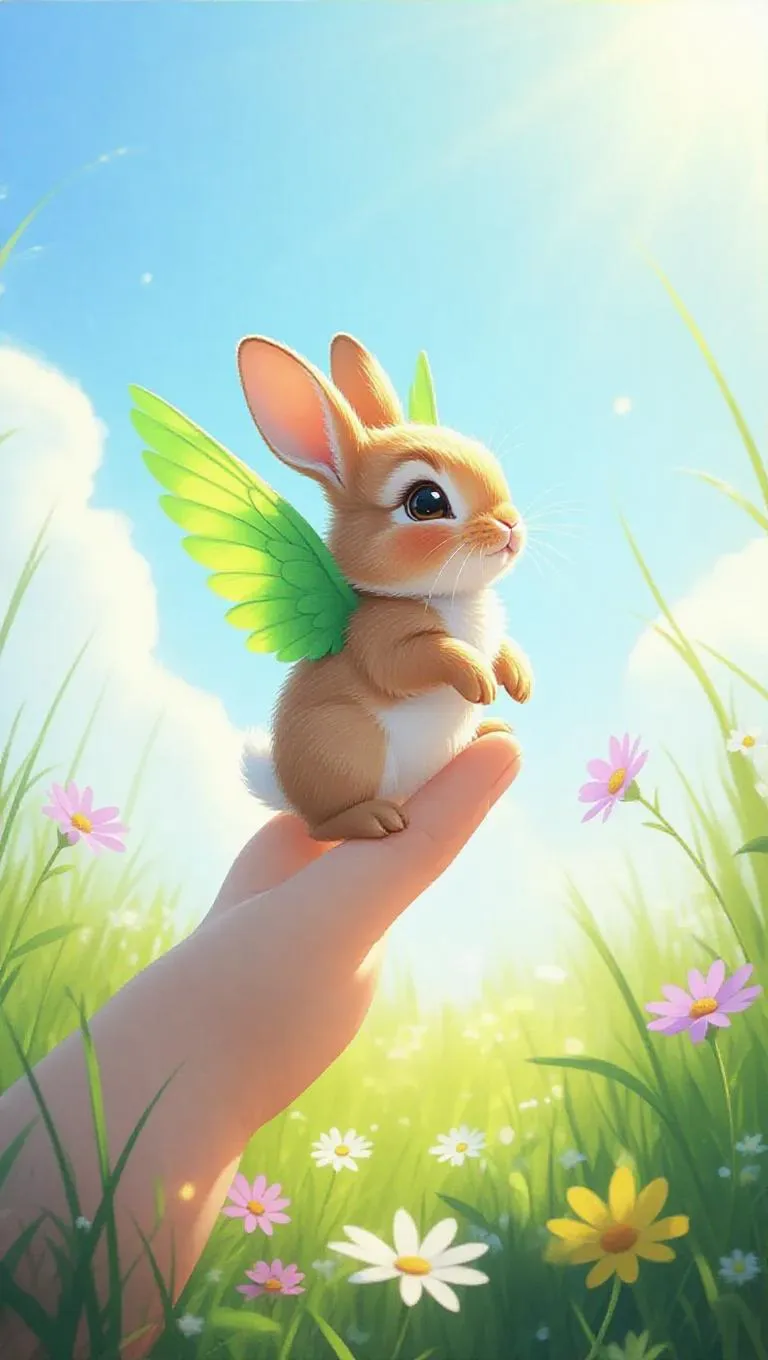 A little bunny with green wings on its back clings to the end of someone's finger. The little bunny wiggles its wings, floats up, and slowly hovers. The scene is set in a sunny meadow with blooming flowers and tall blades of grass, creating a cheerful and whimsical atmosphere. The style is reminiscent of a children's storybook illustration, with soft edges and bright colors.