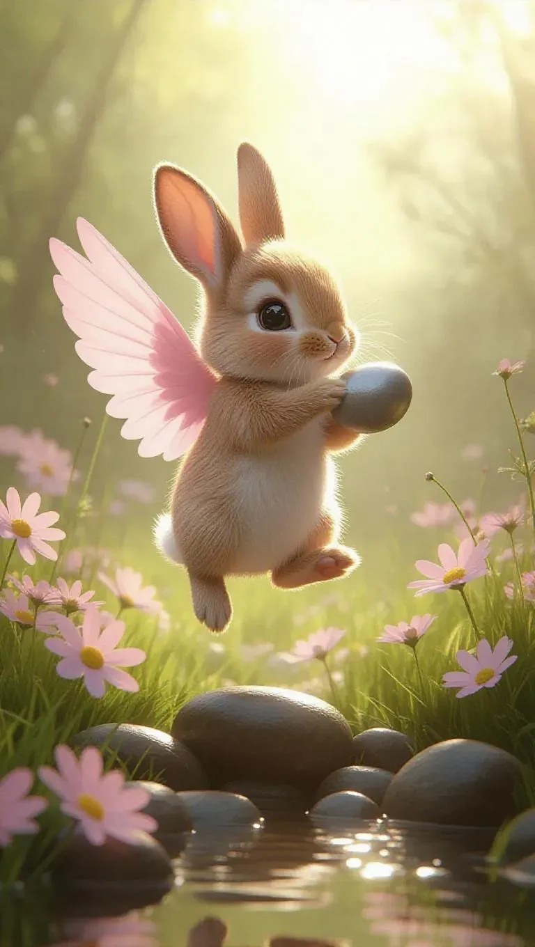 A little bunny with pink wings on its back clings to a shiny pebble. The little bunny wiggles its wings, floats up, and slowly hovers. The scene is set in a sunny meadow with blooming flowers and a gentle stream, creating a cheerful and whimsical atmosphere. The style is reminiscent of a children's storybook illustration, with soft edges and warm colors.