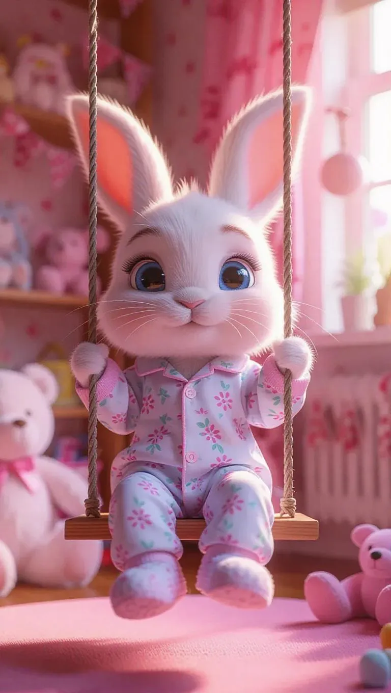 Full body, tiny cute little white bunny with blue eyes, delicate eyelashes, blush on the cheeks, cute, cartoon, photorealism, in a charming children's room, dressed in adorable children's pajamas, wearing cute children's slippers, riding on a whimsical children's swing, surrounded by soft toys and colorful decorations.