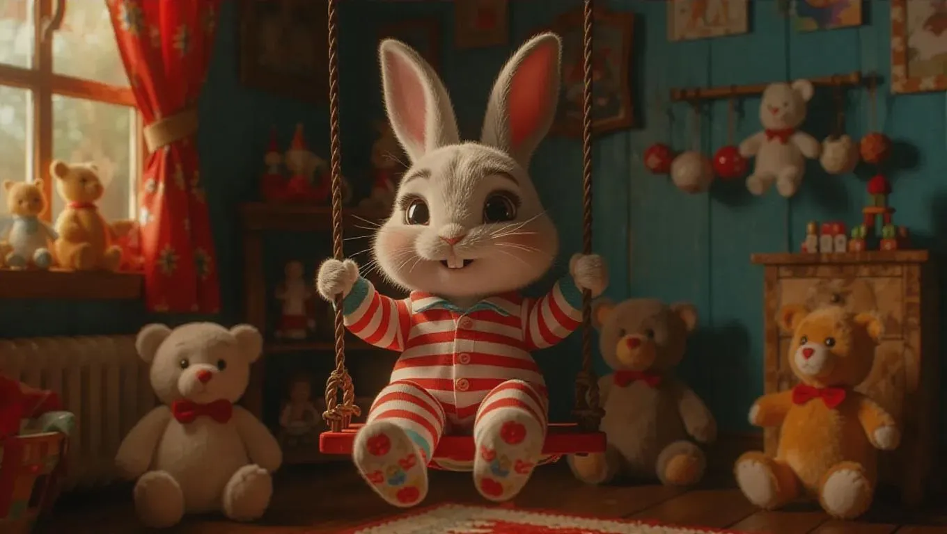 Full body, tiny cute little white bunny with grey eyes, delicate eyelashes, blush on the cheeks, cute, cartoon, photorealism, in a retro children's room, dressed in adorable striped pajamas, wearing cartoon character slippers, riding on a silly children's swing, surrounded by nostalgic toys and lively decorations.