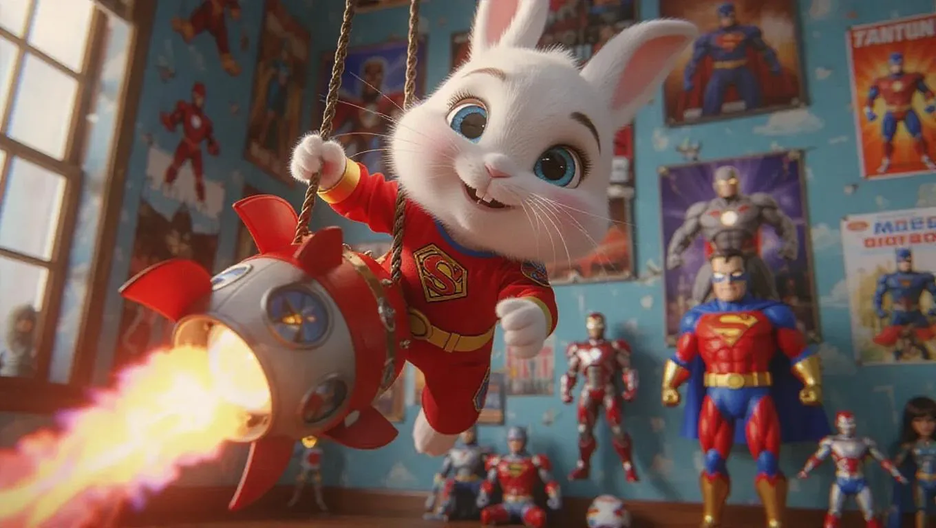 Full body, tiny cute little white bunny with blue eyes, delicate eyelashes, blush on the cheeks, cute, cartoon, photorealism, in a themed children's room, dressed in superhero children's pajamas, wearing cool children's slippers, riding on a rocket ship swing, surrounded by action figures and colorful posters.