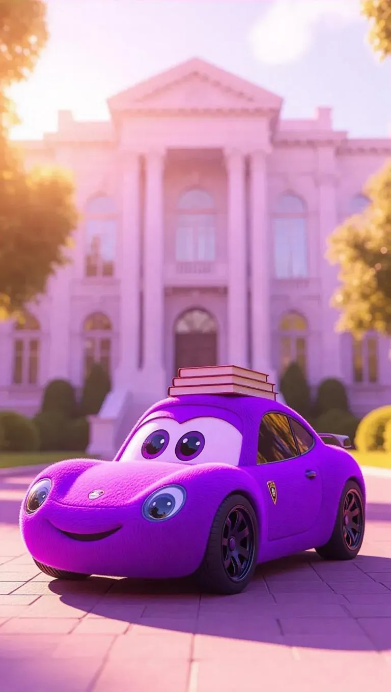 A sleek, Jellycat-style race car with soft, rounded edges and large, expressive eyes is parked in front of a grand library in a serene, pastel-colored neighborhood. Its body is covered in plush, soft purple fur, with brown paws and a tiny, adorable book stack on top. The midday sun above is bright and cheerful, and warm, gentle rays illuminate the scene, casting soft shadows and highlighting the car's cuddly texture. The scene exudes a playful, scholarly charm, perfect for a children's storybook.