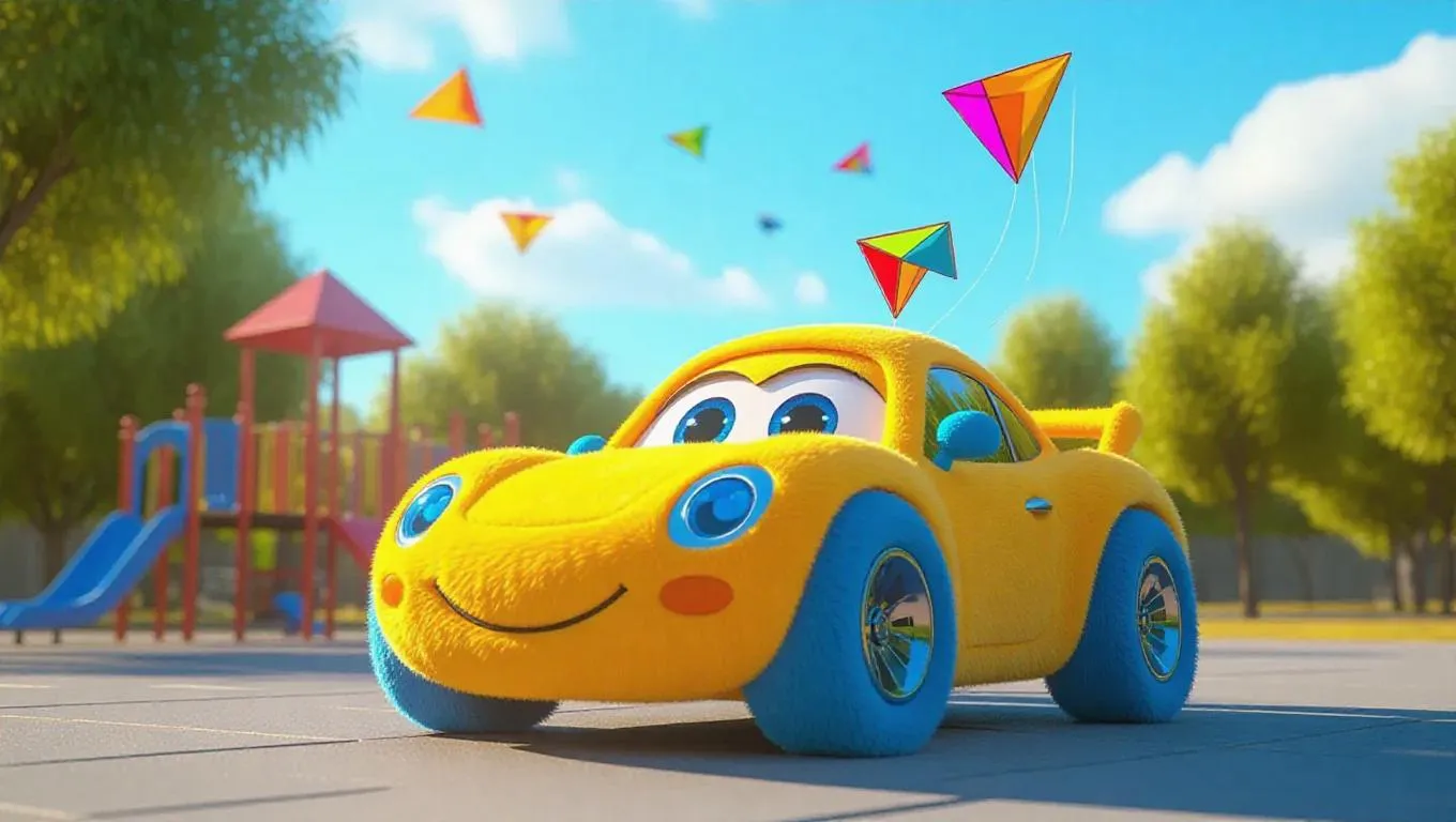 A sleek, Jellycat-style race car with soft, rounded edges and large, expressive eyes is parked in front of a cheerful playground in a bright, sunny community park. Its body is covered in plush, sunny yellow fur, with sky blue paws and a tiny, adorable kite on top. The vibrant blue sky is dotted with colorful kites soaring high, and warm sunshine fills the air, casting gentle shadows and enhancing the car's cuddly texture. The scene exudes a playful, adventurous charm, perfect for a children's storybook.