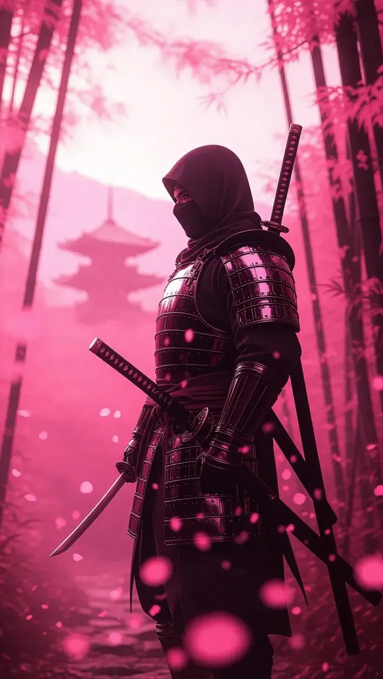 A mythical ninja stands poised in a dreamlike bamboo forest bathed in soft rosy hues. Cherry blossoms drift through the air, their petals glowing under the ethereal pink mist that blankets the scene. The ninja, clad in elegantly detailed black and silver armor with pink accents, holds a gleaming tanto reflecting the warm blush of the sky. A distant shrine and mist-covered hills fade into the background, enhancing the serene yet powerful atmosphere. The mood is a fusion of stealth and tranquility, blending traditional ninja aesthetics with a surreal, rosy-hued fantasy world. Cinematic, semi-realistic with soft fantasy elements and a painterly touch.