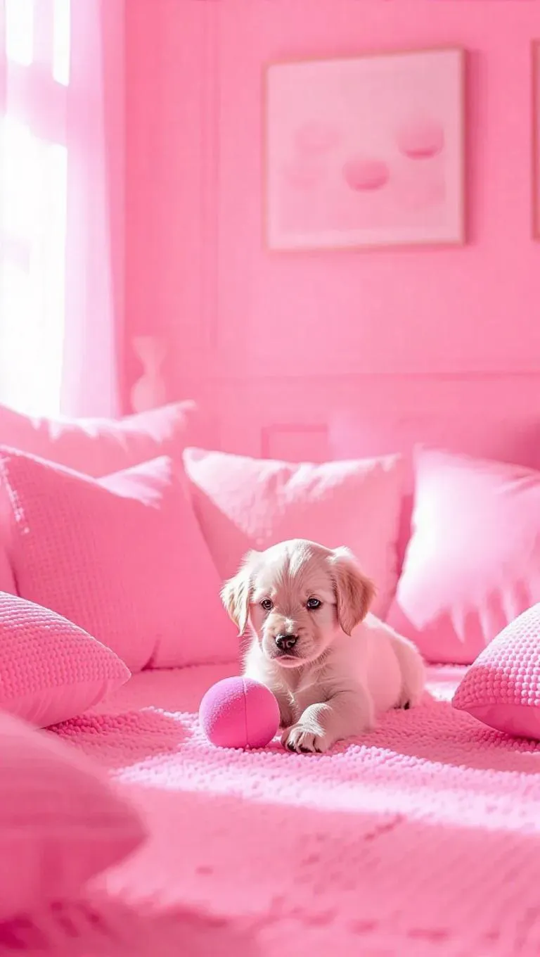 A pink world where a puppy is playing with a pink ball in a room filled with pink cushions and soft pink light. The walls are adorned with pink paintings, and the floor is covered with pink rug. The scene is warm and inviting, perfect for a cozy afternoon.