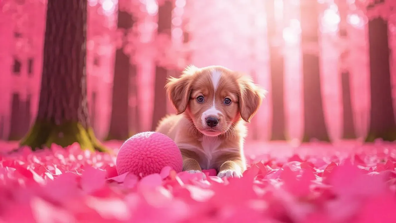 A pink world where a puppy is playing with a pink ball in a forest filled with pink trees and soft pink light. The ground is covered with pink leaves. The scene is warm and inviting, perfect for a cozy afternoon.