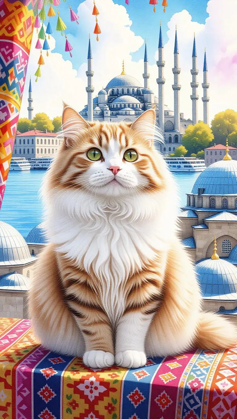 Watercolor portrait of a fluffy Istanbul, vibrant hues blending seamlessly, capturing the whimsical charm of ornate mosques, the Bosphorus Strait, and bustling bazaars, framed by colorful textiles and a sunny sky in a toy-like world.